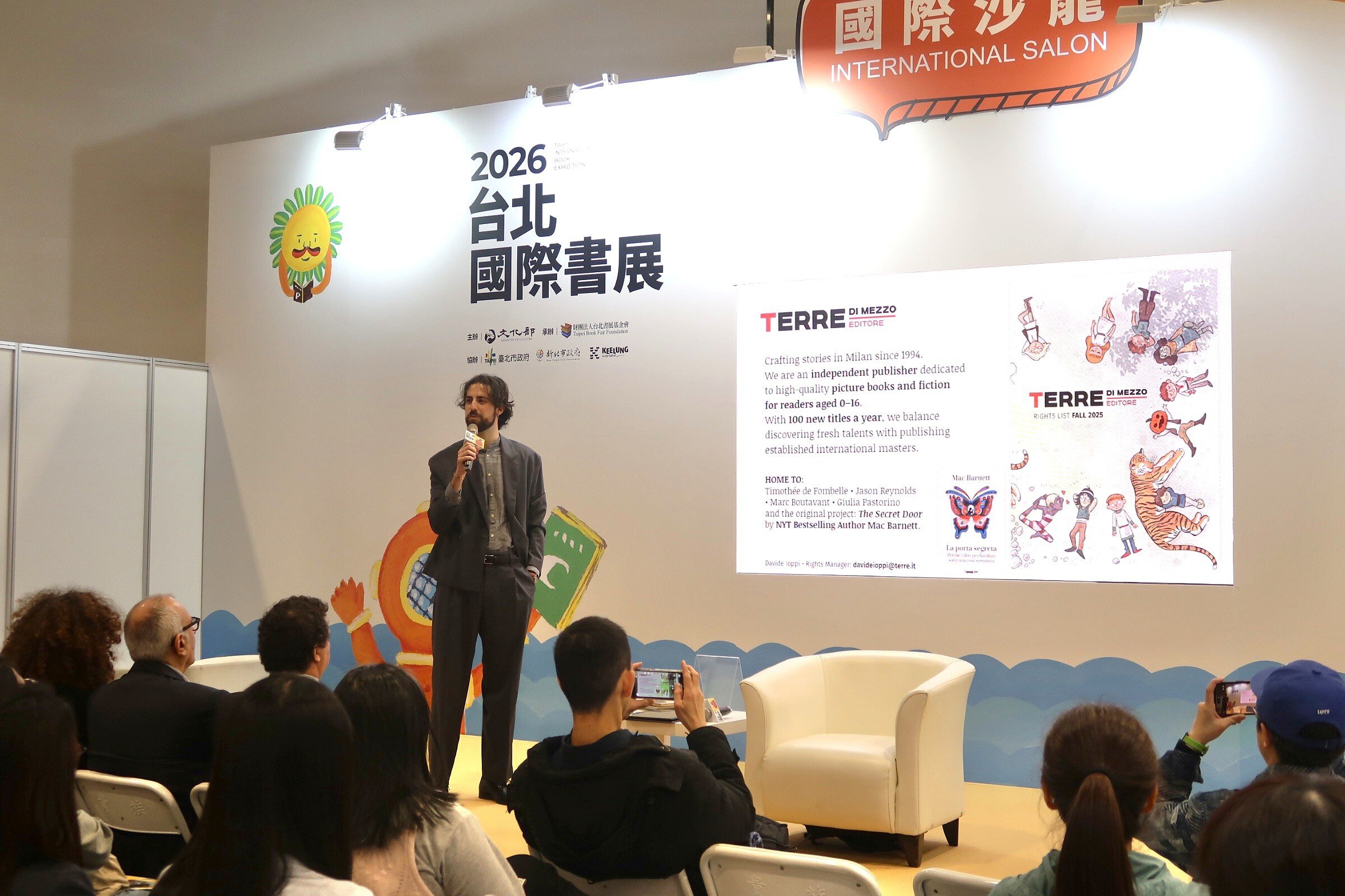 2026 台北國際書展於 2/4 在國際沙龍舉辦座談「義大利出版面面觀」,由義大利經濟貿易文化推廣辦事處代表龍博文(Marco Lombardi)致詞開場。講座現場四間義大利出版社——Carlo Gallucci Editore、DACO、Edizioni Centro Studi、Terre di mezzo Editore、Lo Scarabeo——分享各自的出版理念與精選書目。