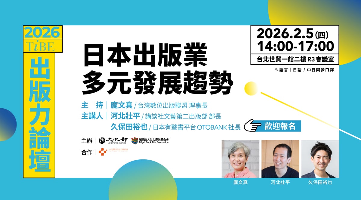 「2026TIBE出版力論壇」由台灣數位出版聯盟理事長、Readmoo讀墨電子書執行長龐文真主持,邀請來自日本出版與有聲內容產業第一線的重量級講者——河北壯平(講談社 文藝第二出版部部長)與久保田裕也(日本有聲書平台 OTOBANK 社長),從小說編輯與有聲內容平台經營的第一線經驗出發,分享日本出版業的多元發展趨勢,並探討內容如何在不同媒介中持續轉化與延伸。