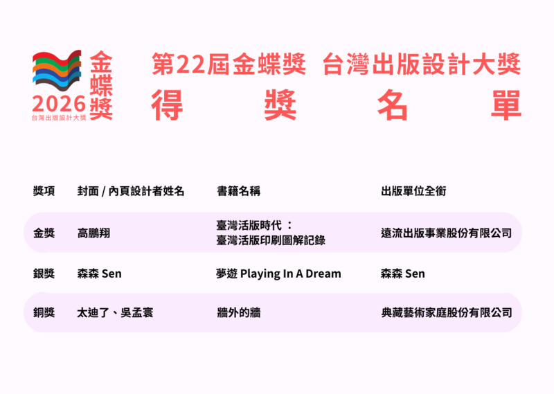 2026年邁入第22屆的「金蝶獎-台灣出版設計大獎」,決審選出最後13強,並由高鵬翔《臺灣活版時代:臺灣活版印刷圖解記錄》、森森Sen《夢遊 Playing In A Dream》、太迪了/吳孟寰《牆外的牆》,拿下金、銀、銅三獎,展現台灣書籍設計的高度創作能量!