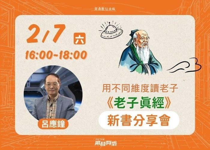 如果你以為老子的思想只是在講「道法自然」、提倡「無為而治」 那這場講座,可能會直接刷新你對老子的想像。 我們特別邀請被媒體稱為「台灣飛碟UFO研究教父」的呂應鐘(筆名:呂尚)到場開講,帶你用最接地氣、最能落地的方式,走進《老子真經》,把老子的智慧從「玄」變成「可用」。 呂尚教授也將分享他自述於2015年經歷的一段不可思議事件:他認為老子以「傳訊」方式與他對話,並由此展開對整部《道德經》的重新理解,提出「流傳本可能歷經改動」的思考與證據線索。