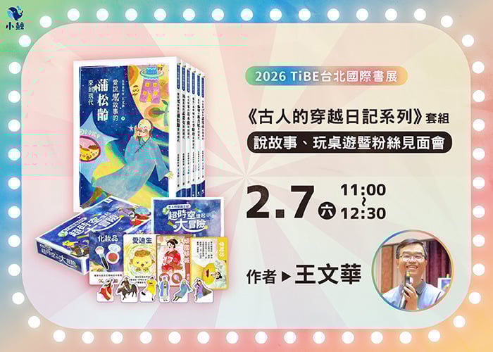 古人,真的穿越來現代了!? 如果六位歷史人物突然出現在你面前,他們會怎麼看待我們的世界? 金鼎獎作家王文華老師,以幽默又貼近孩子生活的方式,帶著蒲松齡、孟姜女、花木蘭、李時珍、楊貴妃與諸葛亮,一起展開跨越古今的冒險。 分享會中,王文華老師將聊聊為何讓古人穿越、如何讓孩子「不背歷史」,也能用故事理解時代與價值,並看見勇氣、自信與選擇的不同樣貌。 現場還可體驗「超時空憶起大冒險」桌遊, 讓孩子在歡笑中愛上歷史,在故事與遊戲中學會思考。 誠摯邀請親子、老師與喜歡故事的你,一起參加!