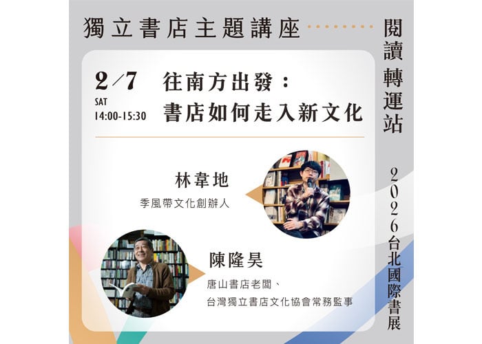 首頁 活動行事曆 *主辦單位保有最終活動變更、調整或取消之權利。*活動內容可能會有變動,請以現場為主。 活動 v 可點選 ☑沙龍場地 查詢 活動 論壇 優惠 主題廣場 藍沙龍 黃沙龍2F 紅沙龍 兒童沙龍 國際沙龍 直播室 泰國主題國館 展位內活動 無障礙服務 聽打 手語 2026 02/03 2026 02/04 2026 02/05 2026 02/06 2026 02/07 2026 02/08 往南方出發:書店如何走入新文化 時間 14:00 - 15:30 地點 公民書區 共同講座區 主講人 林韋地(季風帶文化創辦人) 與談人 陳隆昊(唐山書店老闆、台灣獨立書店文化協會常務監事) 詳細內容 呼應主題國泰國,邀請同樣對東南亞文化及出版有熟悉度的韋地分享經驗與觀察。 1 顯示第1-1筆,共1筆結果