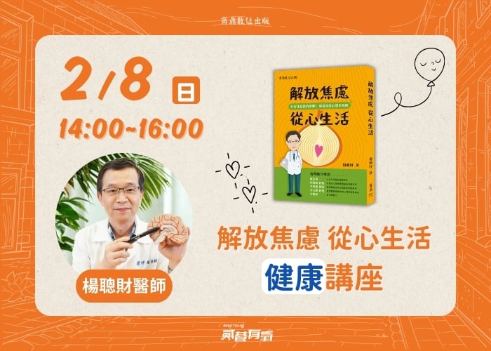 本次活動特別邀請精神科權威、公共衛生醫學博士 楊聰財醫師,以《解放焦慮.從心生活》為核心,帶大家認識「焦慮」這個現代人最熟悉卻又最不了解的情緒 >「焦慮」到底是怎麼一回事,為什麼越來越難放鬆? >分辨「偶爾緊張」與「需要求助」之間的界線 >學會幾個在家就能開始做的減壓方法 作者介紹 楊聰財醫師 學歷: 美國杜蘭大學公共衛生醫學博士 哈佛大學公共衛生學院博士後研究進修 經歷: 美國長春藤賓州大學醫學院精準睡眠認證醫師 楊聰才身心診所暨心理衛生中心 院長 國防醫學院 三軍總醫院 臨床教授 衛生福利部公共衛生/精神醫學/心理健康專家顧問