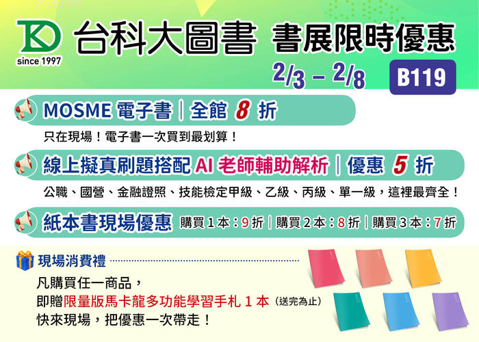 台科大圖書於2026年台北國際書展期間推出限時優惠,時間為 2/3–2/8,展位 B119。MOSME電子書全館 8折,僅限現場購買;線上擬真刷題搭配AI老師輔助解析享5折,涵蓋公職、國營、金融證照與技能檢定等。