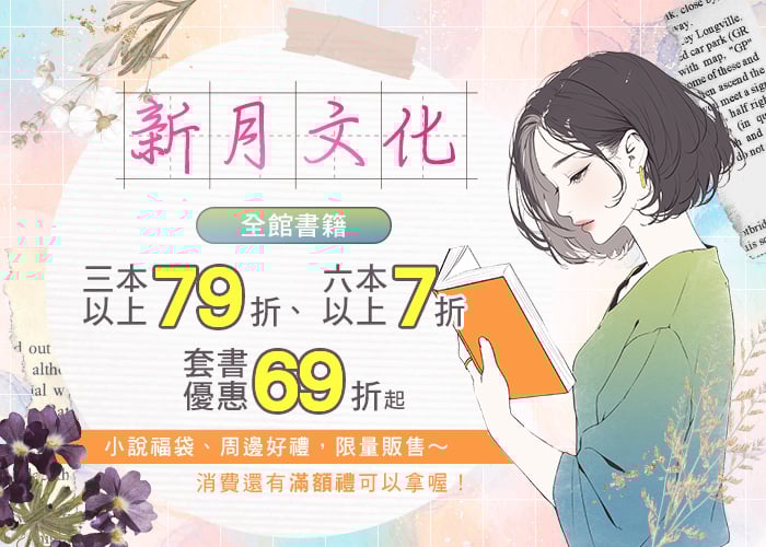 新月全館書籍85折,三本以上79折,六本以上7折,套書優惠69折起!