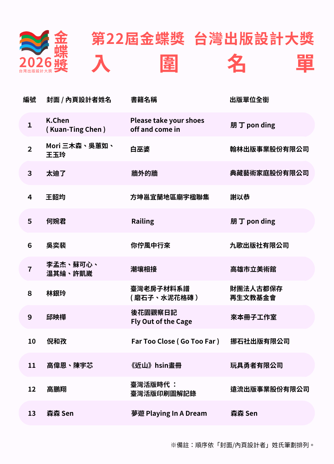 邁入第22屆「金蝶獎」台灣出版設計大獎,由台北書展基金會主辦,國立臺灣師範大學圖書館協辦,是國內表揚書籍設計最重要的獎項。參賽資格以自2024年7月1日起至2025年6月30日初版或改版重新設計之台灣原創出版品為主,今年報名作品總計有175件,選出13件入圍作品,將頒發金獎、銀獎、銅獎各1名,及榮譽獎10名。金銀銅獎三位得主亦將於2025年12月中旬公布。