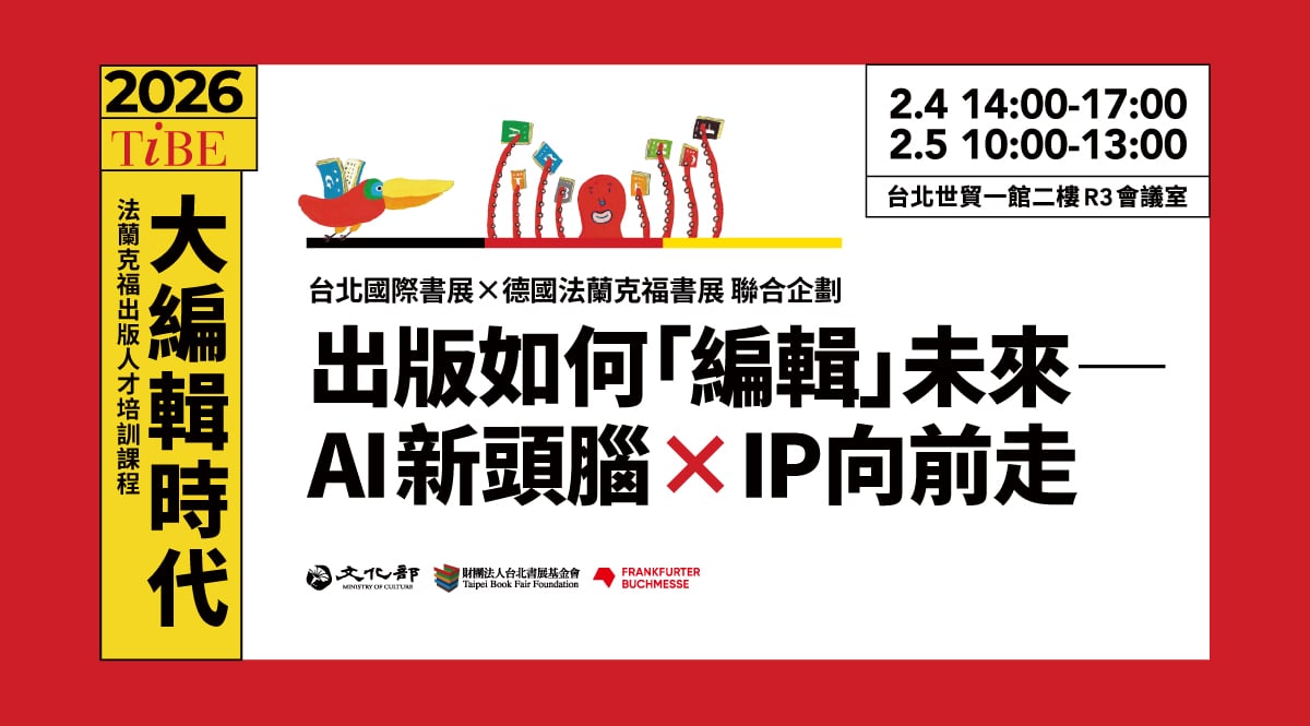 在閱讀環境快速變動、AI 逐步進入出版流程的當下,出版工作持續面臨新的挑戰與選擇。由台北國際書展與德國法蘭克福書展共同規劃,本課程延續多年來為出版專業人士累積的實務觀點與國際經驗,以「大編輯時代」為主軸,聚焦於新世代讀者、AI 應用下的出版實務,以及選書、版權與故事發展等關鍵判斷,帶領出版工作者回到內容選擇、工作流程與後續發展的關鍵時刻,重新看見:出版的未來,正是在一次次專業判斷中,被持續「編輯」出來的。